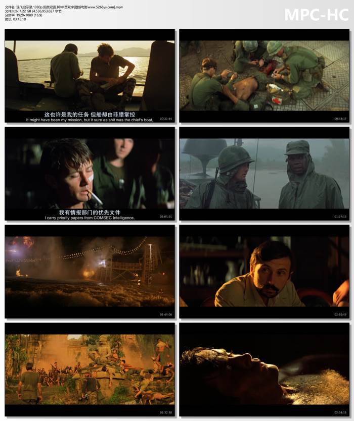该片表面上在讲越战,但在所有著名的战争片中,它可能是“升华”程度最高的一部。它可以套用于任何战争,甚至广而言之说它表现任何人生经历都不为过。影片虽然不乏对战争的正面描写,但它的精髓是刻画人性中的黑暗,难怪它不是以越战记录为蓝本,而是改编自英国小说家康拉德的经典名著《黑暗之心》。马龙? 白兰度扮演的这名军官镜头不多,台词和处理均很“虚幻”,仿佛是一种力量,而不是某个人。本片是科波拉对于战争暴力造成人性异化的一种反思,巧妙地将现实主义的题材和象征意义融合在一起,以一名战士沿河寻找白兰度的旅程为线索,展开了一种近乎荒诞的“实况记录”。影片具有一种“大歌剧”般的风格,夸张而华美,带有强烈的表现主义色彩。在飞机上播放瓦格纳《女武神》主题音乐的轰炸场面是这种风格的集中体现,也是本片的经典场景之一。影片获戛纳金棕榈奖。 2001年科波拉推出该片的新版本,比原来的版本多了将近一个钟头。